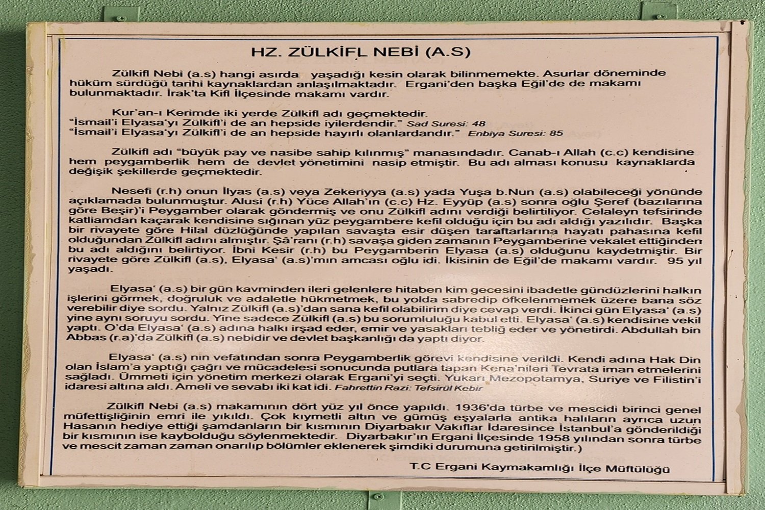 1301/1883, 1308/1890 ve 1318/1900 tarihli Diyarbakır Salnamelerinde, “Nebi Zülkifl’in Peygamber olduğu ve makamının Ergani’de, kabrinin ise Eğil’de olduğu” bilgisi yer almaktadır. Bu türbe, hem dini hem de tarihî açıdan önemli bir ziyaret noktası olmayı sürdürmektedir.